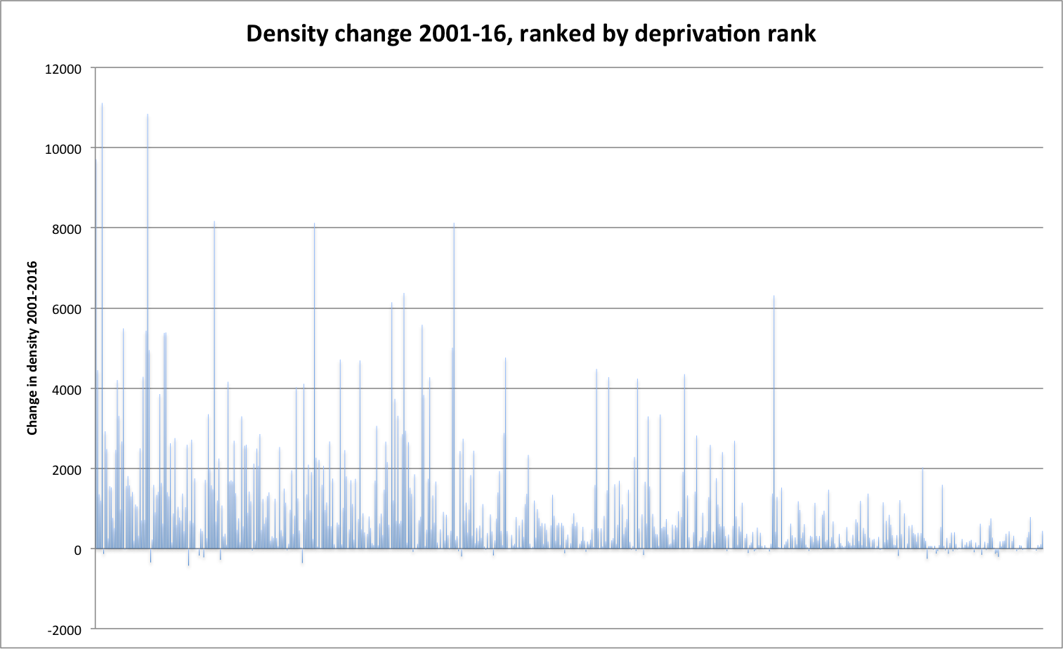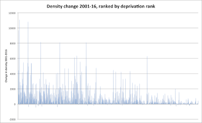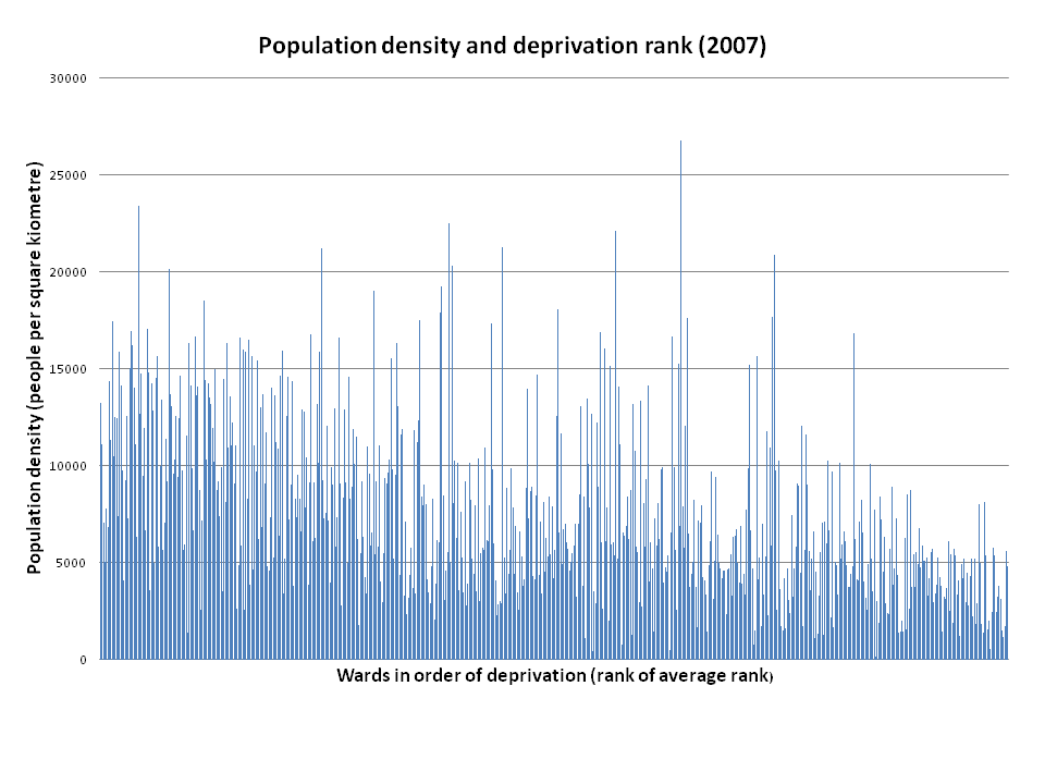 The co-efficient of correlation is -0.48, which implies some relationship between high deprivation rankings and high density, if not a precise one (IMPORTANT HEALTH WARNING: this blog post involves me using statistical formulae and large datasets, so should be treated with something between suspicion and disdain). So far, so unsurprising. Poorer areas are more likely to be in the inner city (so likely to be denser), and also likely to include fewer fripperies like parks that would detract from density (when measured as people per square kilometre, rather than as dwellings per hectare). Prosperous areas that look dense because they are built up may actually be low density in terms of residents (from, for example, single people or couple living in larger flats with spare rooms).