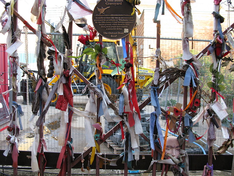 The gate (photo, left, ProfDEH) leads into Cross Bones, an uncon- secrated burial ground first identified as a \’single women\’s church yard\’ in the 16th Century. That is to say, it was a burial site for prostitutes, known as \’Winchester Geese\’ after the Bishop of Winchester who licensed their trade, together with other unsavoury activities (bull and bear baiting, acting etc) that were only permitted south of the River.
