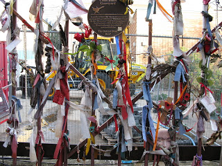 Turning down Redcross Way from Union Street a few days ago, I was immediately confronted by a faded Jubilee Line extension worksite hoarding, a ghost of my own past. Beyond this, a gate was strung with faded flowers and tributes, like the scene of a truly cataclysmic road traffic accident, or the streets of New York after 9/11.