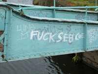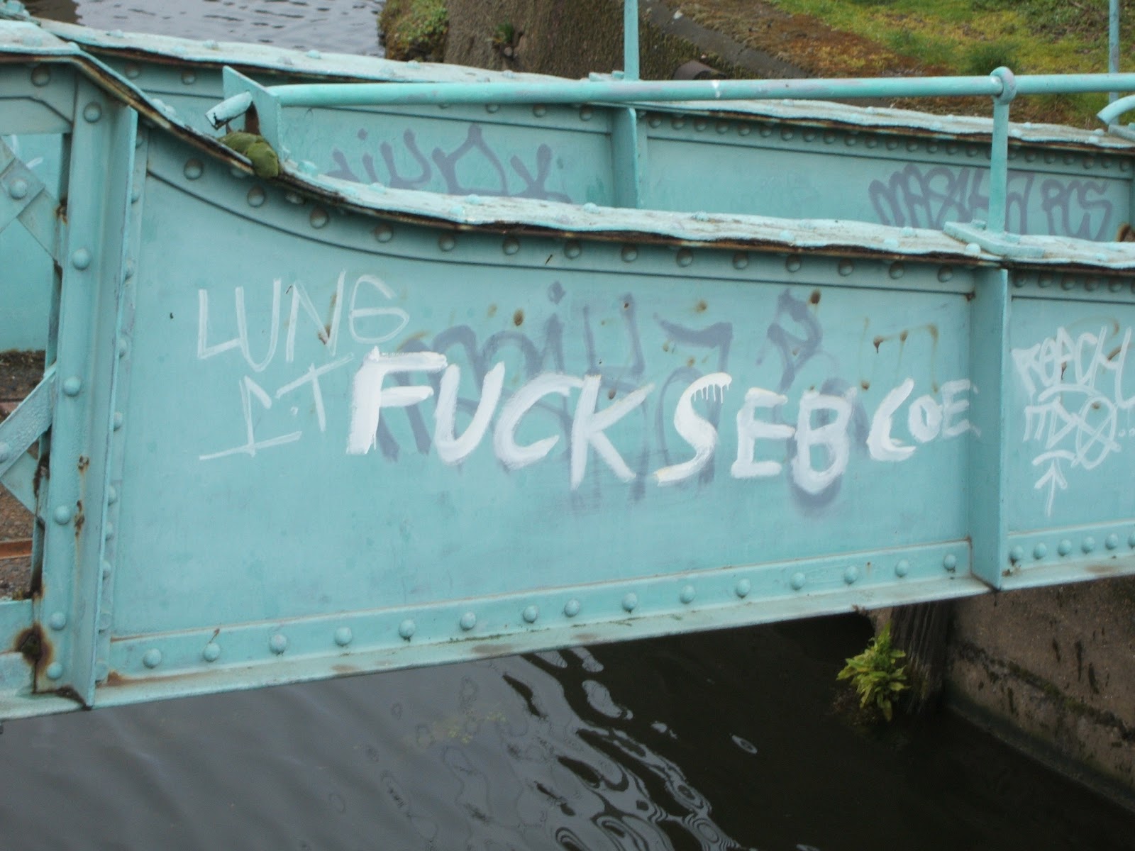 As I walked along the river bank past the bright flower beds, it was the pale green bridge that provoked a dizzy rush of rememberance, more flashback than madeleine. The bridge had been there in 2006, when we passed by on an Easter weekend walk up the Lee Navigation. Just past the \’Big Breakfast House\’ at Old Ford Lock, opposite blank-sided factories, a tributary ran down to a small green bridge, overgrown and inaccessible, on which someone had scrawled \’Fuck Seb Coe\’, in futile protest against the approaching Olympic juggernaut.