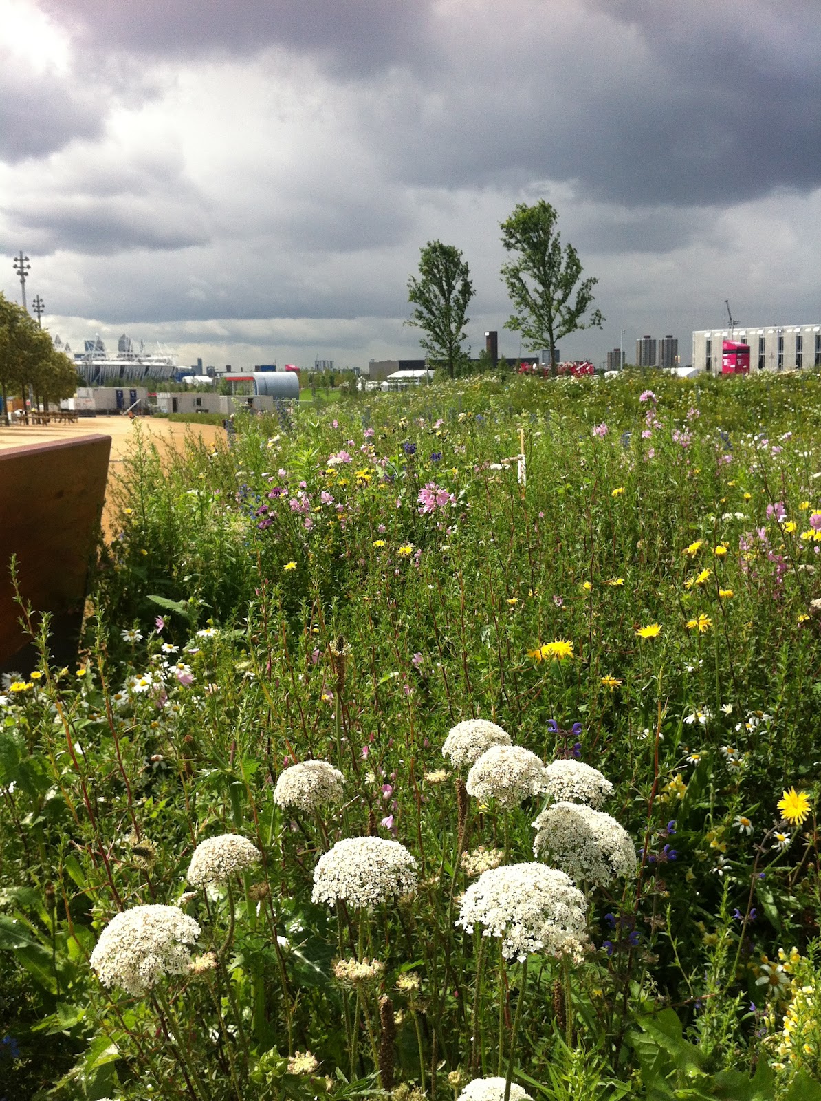 Between the hard angular shapes of the venues, and the wide walkways and concourses, great banks of flowers have erupted: Ox-eye Daisy, Purple Loostrife, Ragged Robin, Cornflower, Corn Marigold, Star of The Veldt, Pot Marigold, Tickseed, Red-hot Pokers, to name a few identified on the website of Nigel Dunnett, consultant horticulturalist.