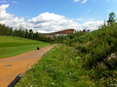 But the fantasy had quickly become real: earth had been cleaned and moved, piles were sunk, and slowly the uncanny structures of the Olympic Park venues had emerged from the mud. Now, days before the opening ceremony, I had the chance to walk again across the site, without hard hat or steel-toecapped boots, past venues familiar from countless bus tours. What is amazing, and delightful, is the verdant landscape.