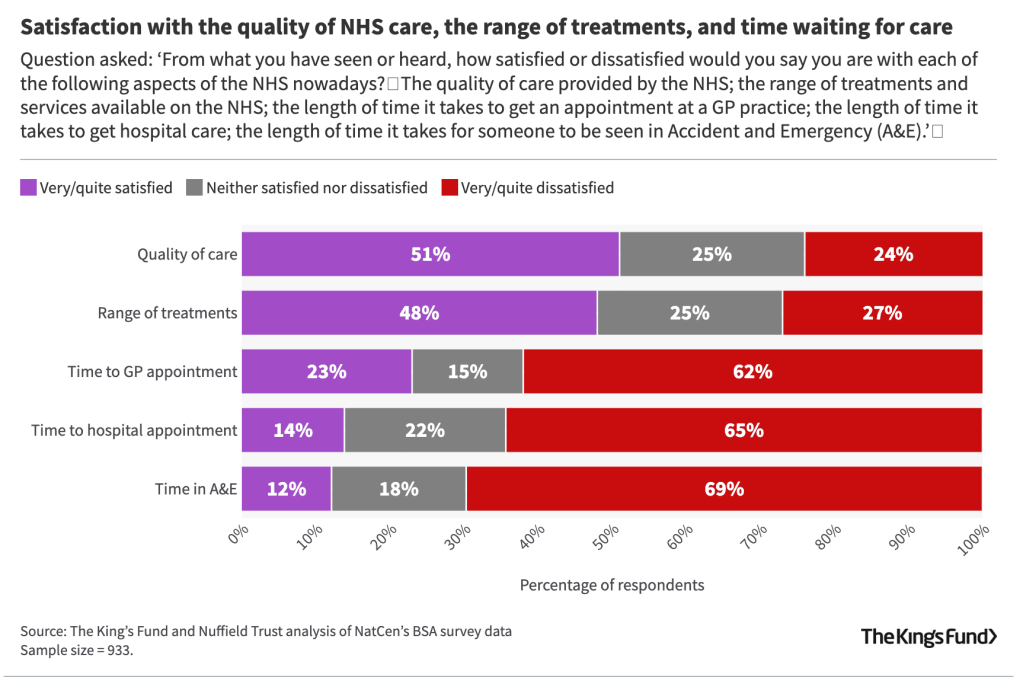 Dissatisfaction is rife across services – from dentistry, to GPs, to A&E, to hospital care, to social services. But it is the time spent waiting – in A&E or for GP or hospital appointments – that rankles most. Only 25 per cent are unhappy with the quality of care or the range of treatments available; around 50 per cent are satisfied.