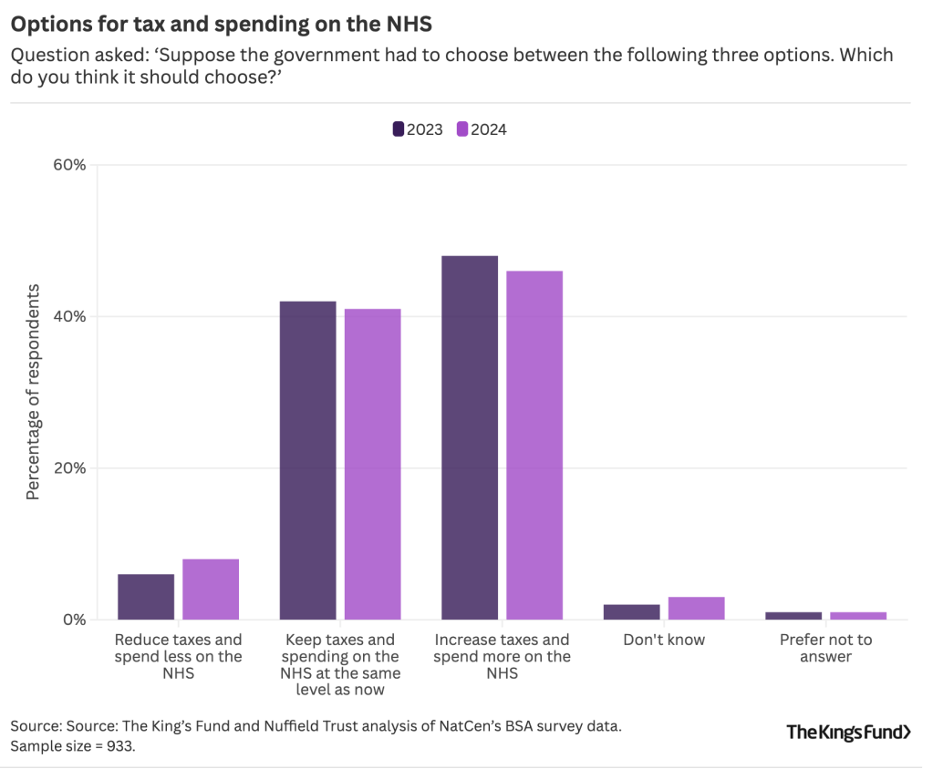 Nearly 70 per cent of people think that the government should spend more on the NHS, but only 46 per cent think taxes should go up to do this, a very slight fall from 2023. These views are not necessarily inconsistent with each other, or with the government’s policy, which has been to spend more on the NHS without raising personal taxes.